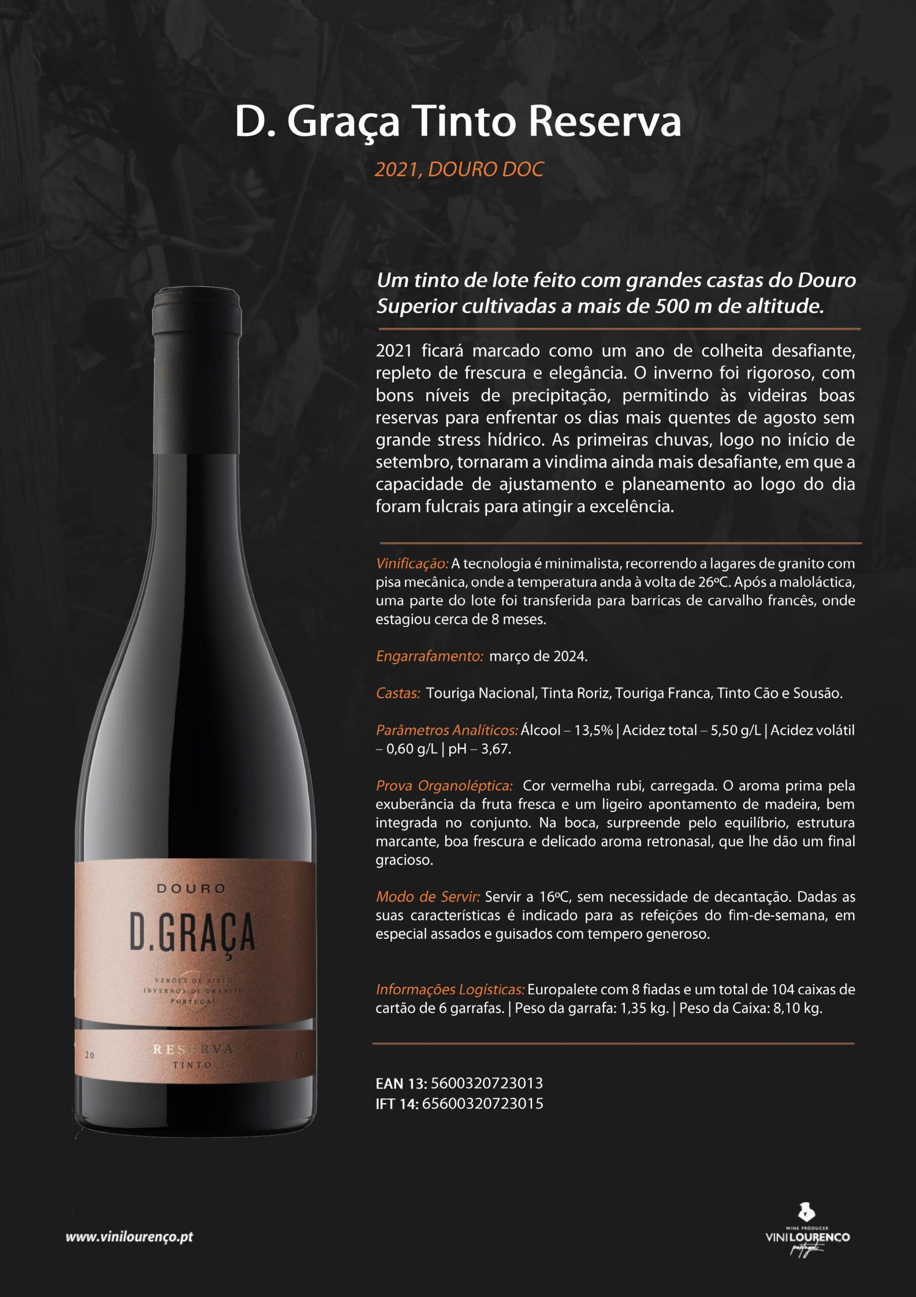 Castas: Touriga Nacional, Tinta Roriz, Touriga Franca, Tinto Cão e Sousão.
